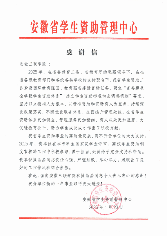 近日,安徽省学生资助管理中心向我校发来感谢信,信中充分肯定了我校在推动精准资助落地见效、全面提升资助育人实效方面取得的显著成绩,高度评价我校为全省学生资助事业的高质量发展提供了坚实支撑和有力保障。省中心特别对我校在本专科生国家奖学金评审、高校学生资助制度审核等核心工作中的深度参与、专业支持与全力配合表示衷心感谢。这既是一份沉甸甸的荣誉,也是对我校落实立德树人根本任务、服务学生全面成长的高度认可。